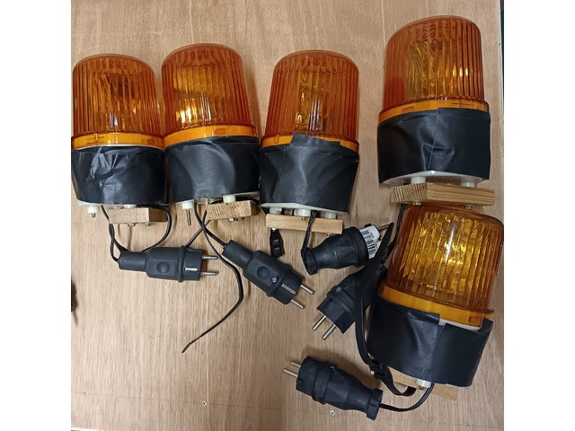 Vend Gyrophare ( Rotary Light ) de couleur orange et vert ( 5 de chaque couleur, donc 10 au total ). Réflecteur rotatif, stroboscope rotatif, sirène sonore, gyrophare d'alarme d'urgence pour poste de garde/circulation. En parfait état car très peu utilisés.Un morceau de tassot en bois à état fixé à leur base pour pouvoir les accrocher en l'air sur une perche. Du gaffer noir a été scotché dessus pour les rendre plus discret.