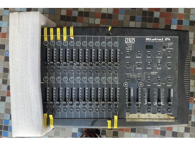 Vends Console de contrôleur DMX pour éclairage scène.Oxo Mistral 24, DMX 24 canaux. 24 circuits pour une préparation ou 2 préparations de 12 circuits.