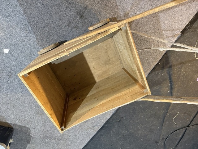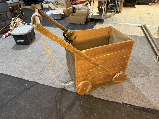 On retrouve une **caisse profonde** (type coffre/transport), **4 roues bois**, et **deux longs brancards** pour traction ou manipulation sur scène qui peuvent facilement être enlever. Une corde est également présente pour la prise en main et la mise en jeu.