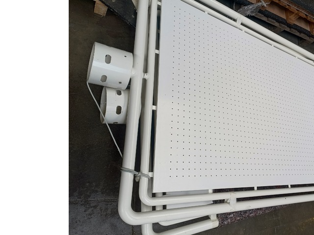 Panneau d’information en métal blanc, conçu pour la signalétique ou la médiation dans les espaces culturels, muséographiques ou événementiels.Sa structure intègre deux zones : une partie supérieure pleine (pour affichage fixe ou visuel principal) et un panneau perforé inférieur (pour supports ou accrochages modulables).