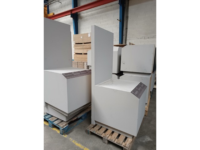 Modules de stèles issus d’une exposition, conçus pour la présentation d’œuvres, de textes ou d’objets. Fabriqués en medium peint, avec surfaces inclinées pour supports de médiation. Leur design sobre permet une intégration facile dans différents contextes scénographiques ou muséographiques.Certains éléments peuvent présenter des traces d’usage ou nécessiter un nettoyage selon les exemplaires.