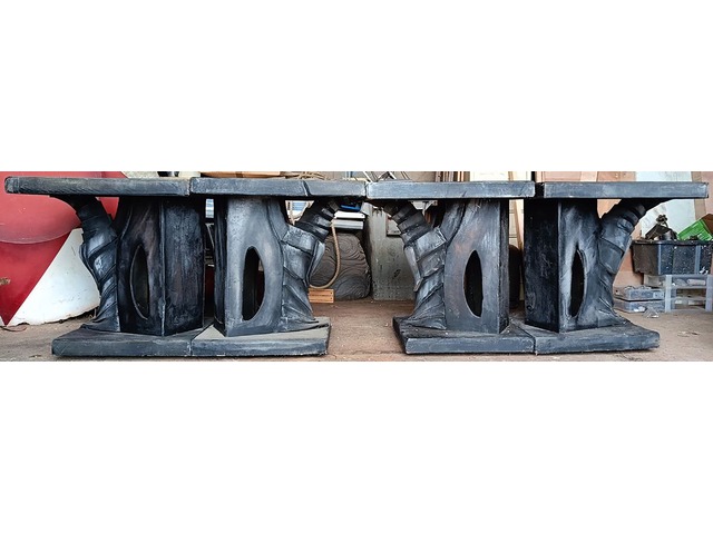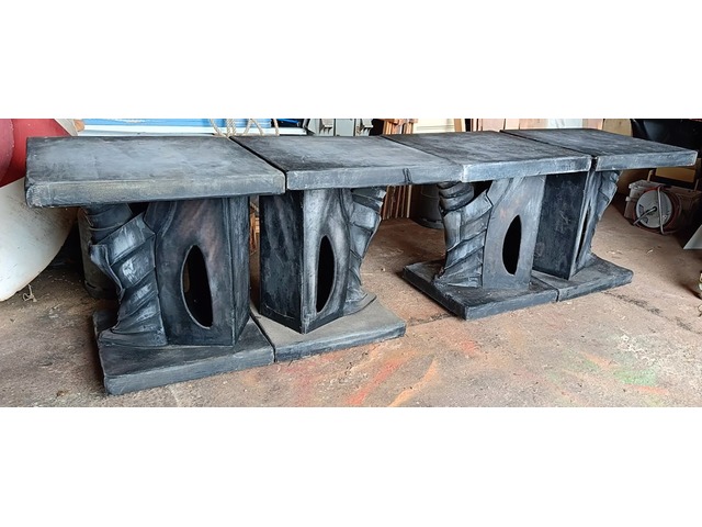 Je propose à la vente ce décor de théâtre composé de quatre éléments autonomes de 80 cm par 80 cm, montés sur des roulettes mobiles. Ils peuvent être agencés selon les besoins ou former une table de 320 cm de long.
