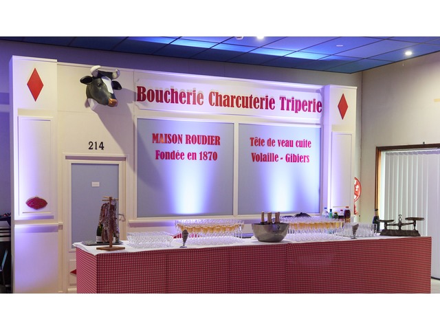 À vendre : Réplique d’une façade de boucherie avec moulures et porte intégrée, permettant un accès.Caractéristiques :