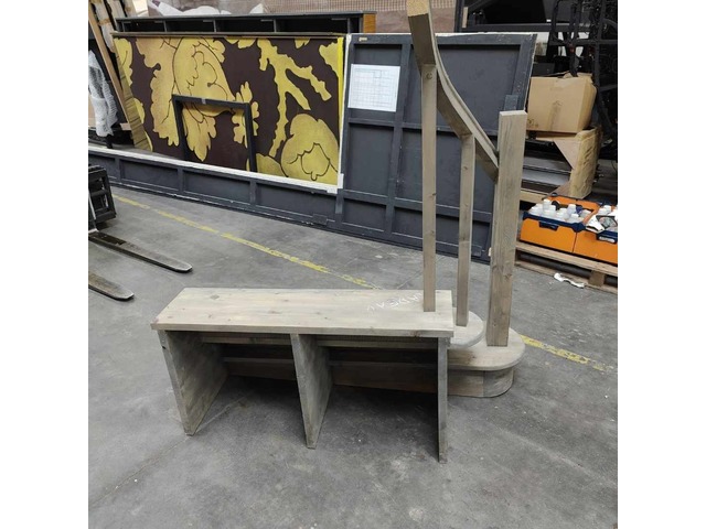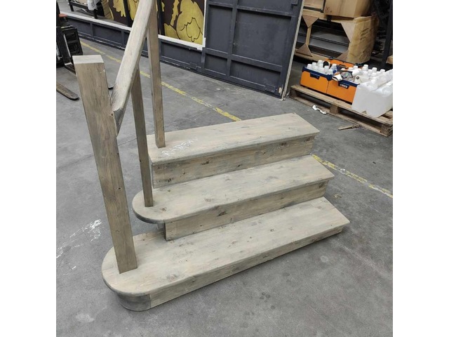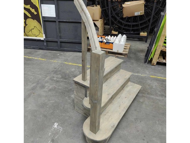 Escalier en bois à pente marquée, conçu comme élément de décor pour scénographie et aménagement de plateau.Structure, marches et rambarde entièrement en bois, finition brute patinée.