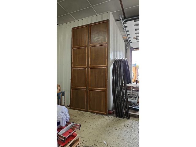 Paire de grandes portes en bois, issues d’un décor scénographique.Finition teintée façon boiserie traditionnelle, idéale pour recréer une ambiance théâtrale, muséographique ou un décor d’époque.