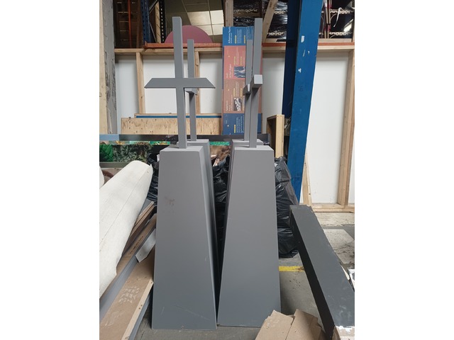 Élément de décor ayant servi dans une exposition sur les chevaliers, conçu comme support pour présenter une armure. Sa forme verticale sculptée évoque une stèle ou un calvaire, ajoutant une dimension symbolique ou monumentale à son usage scénographique.Idéal pour des expositions historiques, des décors de spectacle ou des installations artistiques à thématique médiévale, religieuse ou mémorielle.