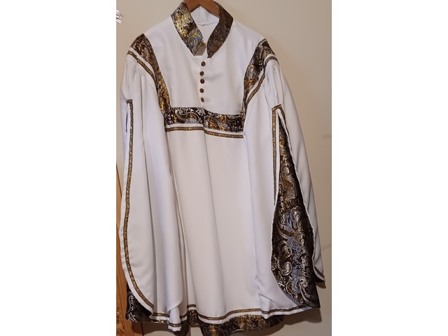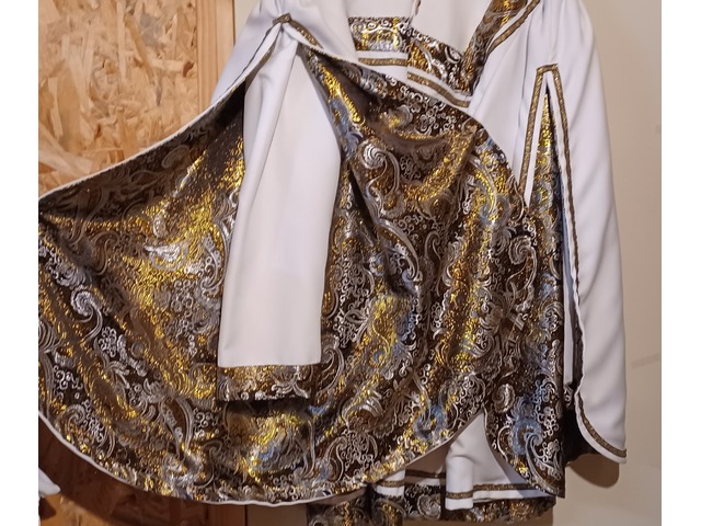 Utilisée sur un mannequin (taille 40-42) pour le prince cendrillon.Tissu uni blanc doublé d'un satin motifs dorés chatoyants.